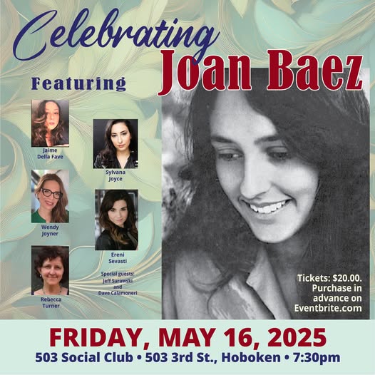 Save the date: Celebrating the amazing talent of Joan Baez at 503 Social Club in Hoboken, with performances by five of the areas most gorgeous voices: Jaime DellaFave, Ereni Sevasti, Sylvana Joyce, Wendy Joyner, Rebecca Turner. Tickets at: https://JoanBaezTribute.eventbrite.com (fb)