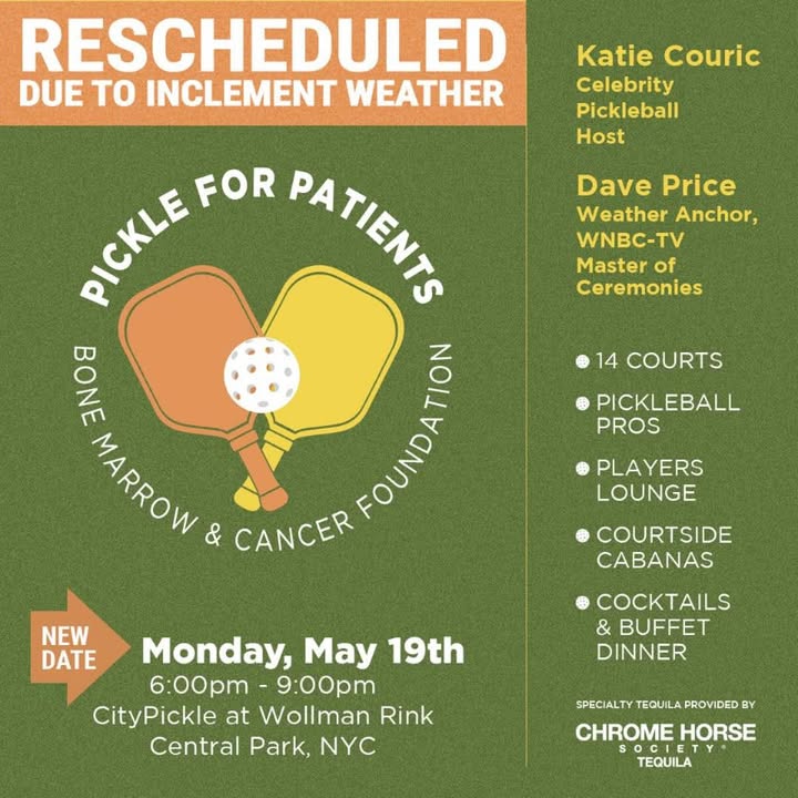 Reminder: the new date for #PickleForPatients is just around the corner! We’ll see you at CityPickle in Central Park on Monday alongside Katie Couric and Dave Price!🏓 Tickets: https://bonemarrow.org/upcoming-events/pickle-for-patients (fb)