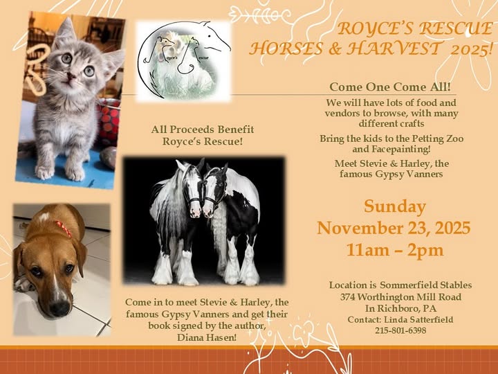 YOU’RE INVITED!! Mark your calendar for Sunday, November 23rd from 11am-2pm for a super fun Fall event at Sommerfield Stables! We would love for you to come and browse our vendors, meet Stevie and Harley, the famous Gypsy Vanners, visit the Petting Zoo and Face Painting and eat some delicious homemade foods! We will have hot dogs! All proceeds directly benefit Royce’s Rescue. Don’t miss it! Location is 374 Worthington Mill Road in Richboro, PA. See you there! (fb)