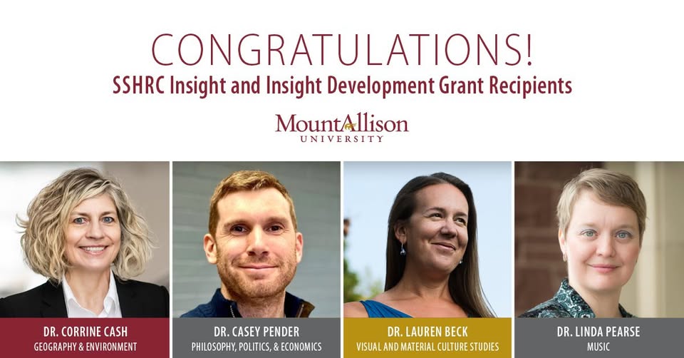 Four Mount Allison faculty members recently received more than $600,000 in grant funding through the Social Sciences and Humanities Research Council of Canada’s (SSHRC) Insight Grant and Insight Development Grant programs — Dr. Lauren Beck (visual and material culture studies), Dr. Corrine Cash (geography & environment), Dr. Linda Pearse (music), and Dr. Casey Pender (philosophy, politics, & economics). Research spans disciplines, including place name and policy, the impacts of colonization on our foodways, disaster risk reduction, inclusive histories of music, and Indigenous economies and exclusion. Read full story: https://mta.ca/about/news/four-mount-allison-professors-receive-more-600000-sshrc-insight-funding-fri-07252025 (fb)