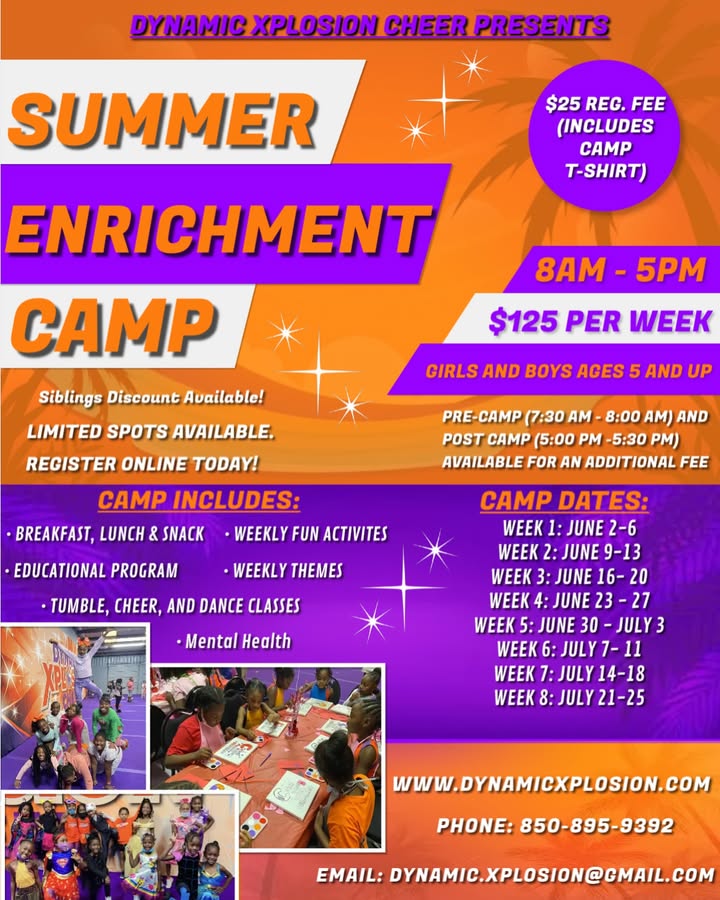 Only 3 spots left for Summer Camp. Register your campers today! Camp Dates: June 2 - July 25, 2025 #summercamp #summertime #tallahasseefl #tallycheer #enrichment #summerenrichment #funtime #cheer #dance (fb)