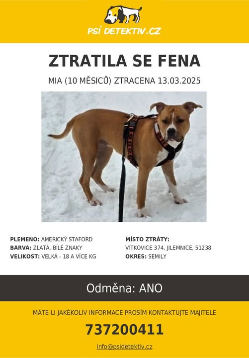 Mia je 10 měsíců stará fenka. Má obojek se jménem a kontaktem na majitele, je čipovaná (945000002710342) a váží cca 30 kg. Je hodná, milá k lidem i zvířatům. Při procházce a chvilce nepozornosti chytla stopu a utekla. Od té doby ji hledáme, jsme na horách a okolí nezná. Mohla přes hřebeny doběhnout kamkoliv. Benecko, Špindl, Vrchlabí, Jilemnice, Rokytnice, i Polsko. (fb)