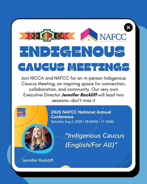📍 Dallas, TX | 📅 August 2 at NAFCC National Conference 2025 “Bigger, Better, Bolder” Join NICCA + NAFCC for an in‑person Indigenous Caucus Meeting! A vital gathering for Tribal child care providers, advocates, and allies serving Native children. Come connect, share, and uplift our collective work. 🌿 ✨ Our Executive Director Jennifer Rackliff will host two inspiring sessions—don’t miss this opportunity to learn, lead, and strengthen our community together! #TribalChildCare #IndigenousEarlyLearning #NAFCC2025 #NICCA #DallasTX (fb)