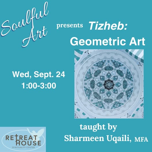 This month we are honored to have Sharmeen Uqaili, MFA, guide us in the unique art form of Tizheb, geometric art. Participants will learn how to create a six-fold geometric pattern using classical compass and straightedge, echoing the rich tradition of Islamic patterns seen in the architecture of Spain, Iran, Morocco, and beyond. Use the link below to register or visit our events page using the link in our bio. https://www.retreathousecommunity.org/purchase/p/soulful-art-4th-wednesdays-2nb5t (fb)