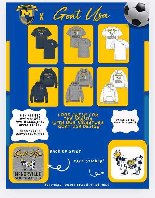 LOOKING FOR AN AWESOME WAY TO SUPPORT OUR CLUB??? SAVE THE DATE TO ORDER YOUR MANORVILLE SC x GOAT USA APPAREL - ON SALE JULY 21ST THRU AUG 4TH ONLY!!! STAY TUNED FOR MORE DETAILS!!! #MSC #GOATUSA #FUNDRAISER 💪😎🐐🔵🟡 (fb)