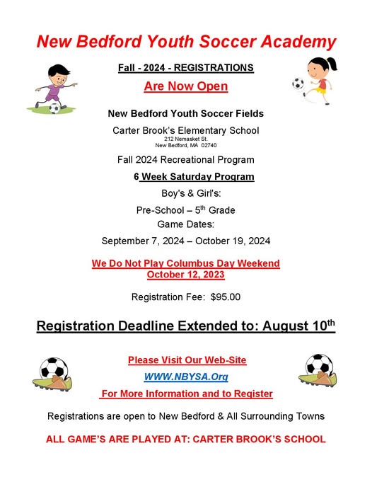 Website Manager New Bedford Youth Soccer Academy NBYSA Fall Season Registration 2024 Fall Registration Closed Fall 2024 Season Dates Fall 2024 NBYSA Fall Season Registration . Now Closed Fall Registration Closed Fall 2024 is Now Closed Fall 2024 Season Dates Fall Soccer Season 2024 starts September 7th thru October 19thThis is a 6week program with 1 rain date which would be on October 26th. Games and practices will be on Saturdays ONLY. Fall 2024 Spanish Translation Fall 2024 Schedule What to Wear Fall Program 2024 News Spring 2025 Registrations Spring 2025 Registrations Our Next Program will be in May 2025.