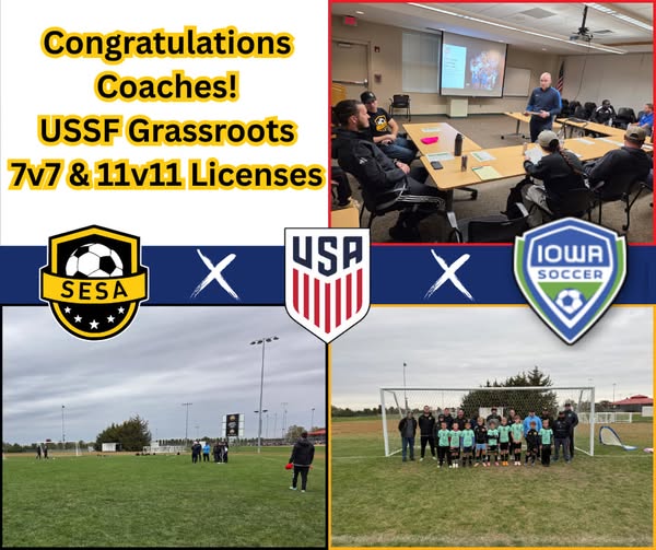 This weekend SESA hosted both USSF 7v7 & 11v11 grassroots license courses. Great work coaches, investing in not just your own development but also improving your ability to support the players you work with! We're grateful to have coaches willing to challenge themselves and grow to be the best they can be and share the #sesaadvantage with players. Big thank you to Iowa Soccer Association and Gareth coming down to lead the courses, we're proud to be a member organization. Looking forward to getting the last couple of coaches through the grassroots pathway, and onto the National D course- with the goal of 100% of SESA coaches holding USSF D licenses or higher! (fb)