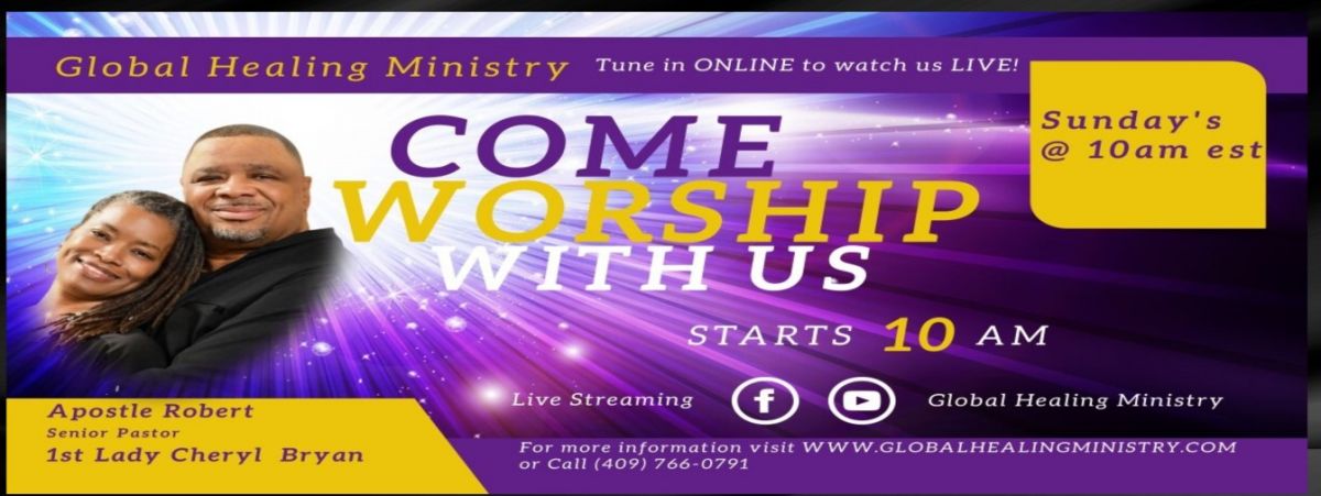 Global Healing Ministry Where Healing Begins With Healing Your Soul Come Experience God With Us Home Leadership Events More A new eChurch committed to being a church where you can enjoy vibrant worship singing and an uplifting word from the Lord. A church that is committed to giving back to the community. Sunday Service Sundays 11am est Facebook Live Robert Bryan Facebook Live Global Healing Ministry Linkedin Robert Bryan YouTube Live Global Healing Ministry Come an enjoy vibrant Worship Singing and an Uplifting Message from the Lord with me Giving The tithes and donations you make to Global Healing Ministry make a difference to our church our community and the people of the world. There are various ways you can donate.