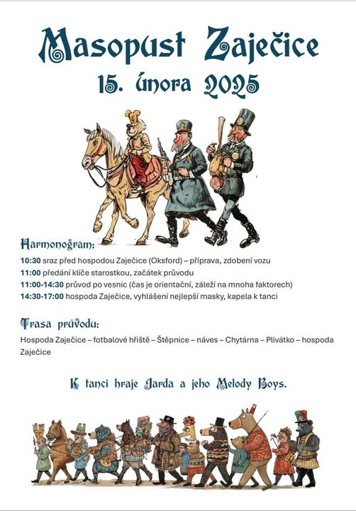 Masopustní průvod volá! 🎭 Přidejte se k nám na tradiční masopustní veselí plné hudby, tance, masek a dobré nálady! 🎉 Přineste si masku, kostým nebo jen chuť se bavit – vítán je každý, kdo má rád zábavu! 🥳 Sdílejte, ať se nás sejde co nejvíce! 🐷🎺🕺 Těšíme se na vás! 🌟 https://sokolzajecice.cz/zajkov/zajecicky-masopust (fb)