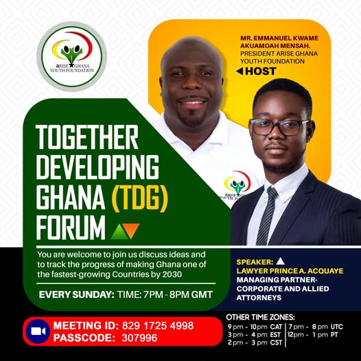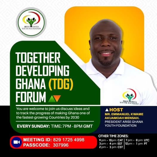 TDG Forum!! TDG Forum!!! Every Sunday at 7 pm GMT Topic for Discussion: A look at year 2 goals This forum is open to everyone interested in helping make Ghana great Click the link below: https://us06web.zoom.us/j/82917254998?pwd=GQobIUhgJEnYGOBh9JZ7jburQEVyYZ.1 The link will be active from 6:50pm See you!! (fb)