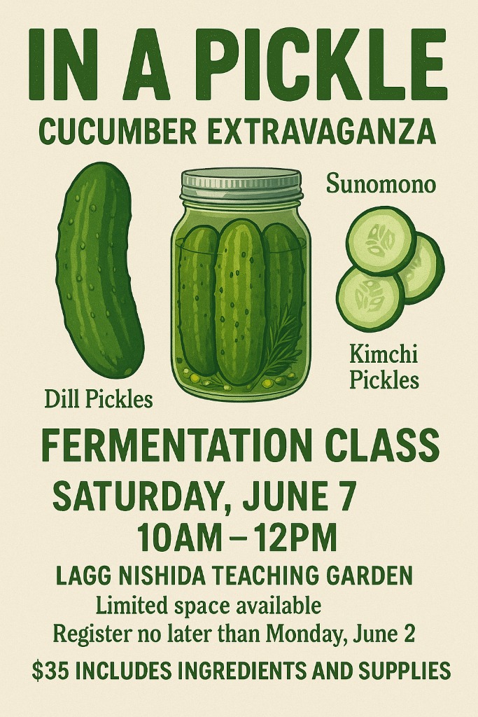 CUCUMBER EXTRAVAGANZA UPDATE: CLASS NOW SOLD OUT. You can send email to be added to wait list. See instructions on event page (linked below). JUNE 7 10am-Noon Cucumber Fermenting workshop. You'll take home a pint jar of kim chee and dill pickles. And you'll also learn to make and eat the class Japanese sunomono pickle salad. $35 Sign by Monday, June 2. https://www.lagreengrounds.org/cucumber_workshop (fb)