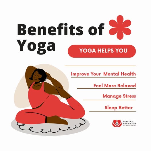 Doctors recommend that many Sickle Cell Warriors participate in moderate exercise to maintain their overall well-being. Yoga is an excellent form of exercise because it offers a wide range of benefits for physical and mental health. It can help improve stress management, mental health, and sleep quality, while also potentially aiding in pain management and the prevention of chronic diseases. Try practicing yoga a couple of times a week to help your mental health, stress management, and overall well-being. #SickleCellDisease #SickleCellAwareness #sicklecellwarrior #sicklecell #invisibleillness #mentalhealth #MinorityMentalHealthMonth #minoritymentalhealth (fb)