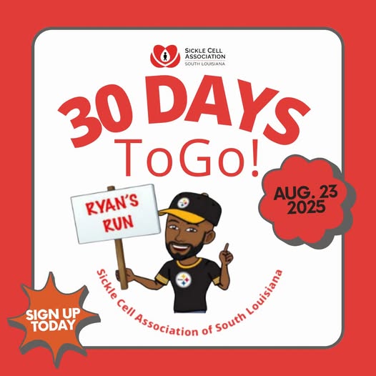We are one month away from our annual fundraiser, Ryan's Run/Walk! It's our 10th year coming together to celebrate the Sickle Cell Warriors in our community. Join us on Saturday, August 23rd, in downtown Baton Rouge as we celebrate, raise awareness, and funds for individuals with sickle cell disease. Grab your friends, family, and colleagues and register today! https://www.skisignup.com/Race/LA/BatonRouge/RyansRun #SickleCellDisease #SickleCellAwareness #sicklecellwarrior #sicklecell #invisibleillness #BrEvents #5k (fb)