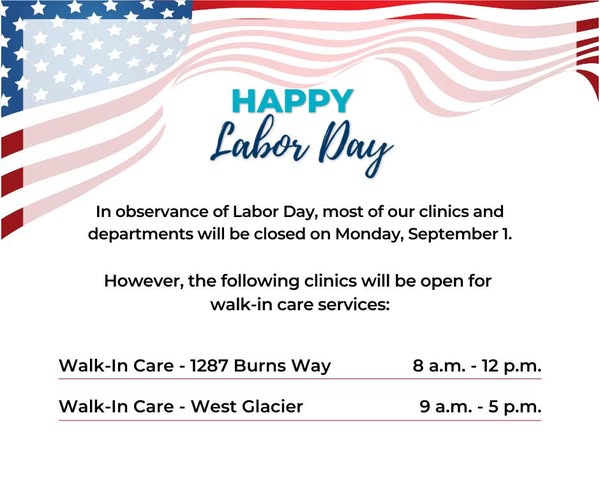 In observance of Labor Day, most of our Logan clinics and departments will be closed on Monday, September 1. The following clinics will be open for walk-in care services: • Logan Health Walk-In Care - 1287 Burns Way: 8 a.m. - 12 p.m. • Logan Health Walk-In Care - West Glacier: 9 a.m. - 5 p.m. In the event of an emergency, please visit the nearest emergency department. (fb)