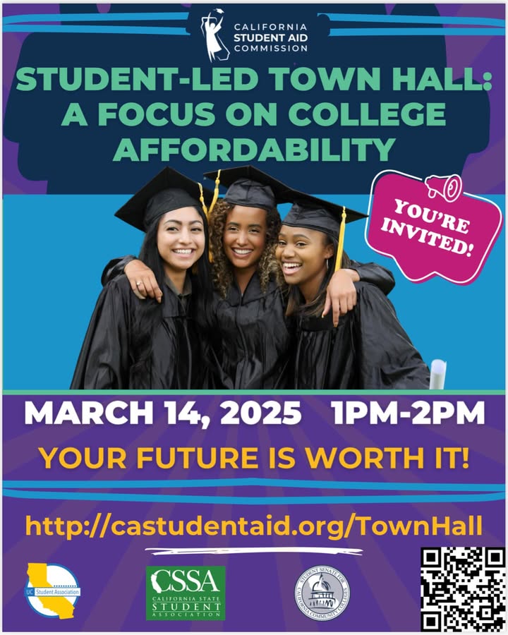 Join statewide student leaders for an engaging discussion on securing financial aid and shaping the future of college affordability in California. Register for the town-hall today! Link in bio (fb)