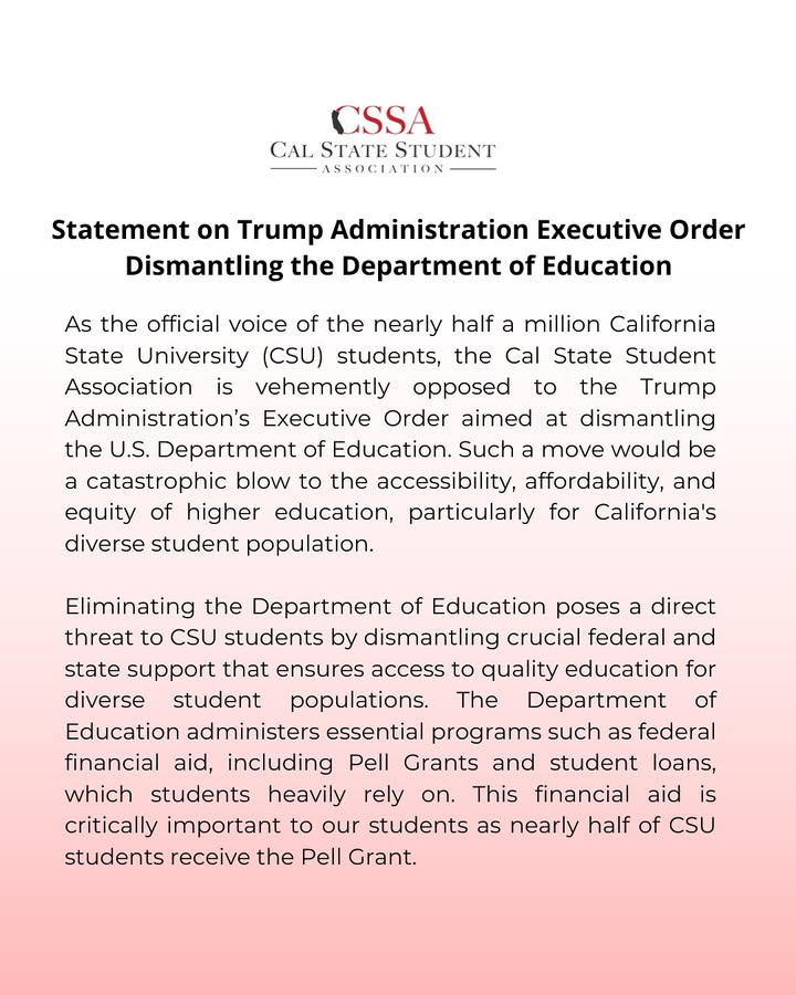 As the official voice of the nearly half a million California State University (CSU) students, the Cal State Student Association is vehemently opposed to the Trump Administration’s Executive Order aimed at dismantling the U.S. Department of Education. Such a move would be a catastrophic blow to the accessibility, affordability, and equity of higher education, particularly for California’s diverse student population. Eliminating the Department of Education poses a direct threat to CSU students by dismantling crucial federal and state support that ensures access to quality education for diverse student populations. The Department of Education administers essential programs such as federal financial aid, including Pell Grants and student loans, which students heavily rely on. This financial aid is critically important to our students as nearly half of CSU students do receive the Pell Grant. Furthermore, the department plays a key role in setting and maintaining academic standards, promoting equity, and supporting initiatives that help students succeed, especially those from underrepresented and low-income backgrounds. Without these resources and protections, many students would face increased financial burdens, reduced opportunities, and diminished support in navigating their higher education journey. The absence of such a department would jeopardize the accessibility and affordability of education, ultimately undermining the opportunities for students at the CSU and across the nation. The CSSA calls upon the administration to prioritize investment in education, not its destruction. We urge Congress and our elected officials to protect the Department of Education and ensure that all students have the opportunity to pursue their academic goals. We will stand in solidarity with students across the nation to defend the principles of accessible, equitable, and quality higher education. (fb)