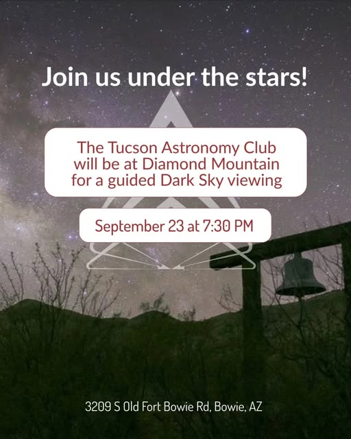 ✨ Join us under the stars! ✨ The Tucson Astronomy Club will be at Diamond Mountain Tuesday September 23 at 7:30 PM for a guided Dark Sky viewing. 🌌🔭 Come experience the brilliance of the Milky Way, planets, and constellations in one of Arizona’s most pristine night skies and newest Dark Sky Approved Lodging. This is a free community event — just bring your curiosity and a sense of wonder! 📍 Diamond Mountain Retreat Center 🕢 Tuesday September 23, 7:30 PM Let’s celebrate the beauty of our desert night sky together. 💫 #wilcox #bowie #safford #az #southernarizona #astronomy (fb)
