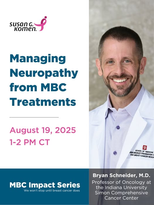 Learn more about recognizing and managing neuropathy while receiving treatment for metastatic breast cancer (MBC) during our next MBC Impact Series webinar. 📆: August 19, 1 PM CT Dr. Bryan P. Schneider, Professor of Oncology at the Indiana University Simon Comprehensive Cancer Center, will discuss signs and treatment. Register: https://bit.ly/4lja0kH Thank you to our partner Merck for supporting the MBC Impact Series. (fb)