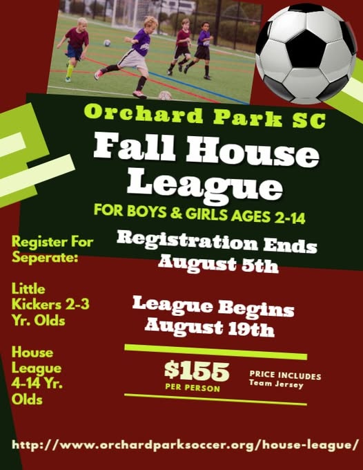 Sign up for our Fall House League and Little Kickers! Registration Open through August 5th!! House - http://www.orchardparksoccer.org/2023-fall-house-league/ Little Kickers - http://www.orchardparksoccer.org/kickers/ (fb)