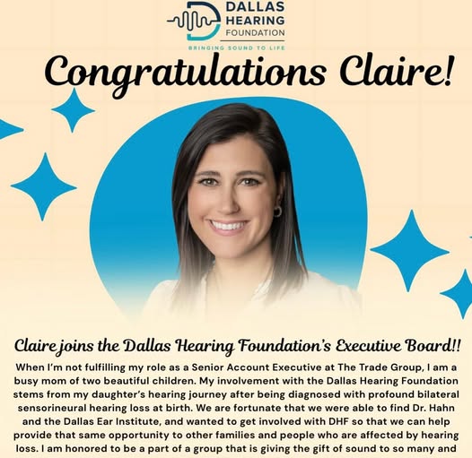 🎉 Congratulations to Claire Phillips! 🎉 We are thrilled to announce that Claire Phillips, a dedicated member of the Dallas Hearing Foundation Advisory Board, will be joining our Executive Board this July! 💙 Claire has been an incredible advocate—not only for her own daughter, who was diagnosed with profound bilateral sensorineural hearing loss at birth—but for countless deaf and hard of hearing children and families. Her journey led her to Dr. Hahn and the Dallas Ear Institute, and her passion for giving back has been unstoppable ever since. As a Senior Account Executive at The Trade Group and a busy mom of two, Claire somehow finds the time to support DHF with unwavering heart and energy. Her commitment to helping others experience the gift of sound is truly inspiring. 🎧✨ Claire, we couldn’t do this without you. Thank you for being such a powerful voice and light in our community. Here’s to this next chapter—we are so lucky to have you on our Executive Board! 💫 #DallasHearingFoundation #HearingLossAwareness #ExecutiveBoard #Advocate #DeafAndHardOfHearing #ThankYouClaire #GiftOfSound #LifeWithoutLimits (fb)