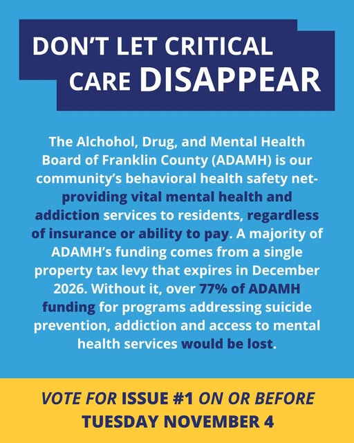Vote YES on Issue 1 The ADAMH Board of Franklin County provides essential mental health and addiction services to residents, no matter their insurance status or ability to pay. Voting YES on Issue 1 means: ✅ A stable source of funding for local mental health and addiction programs ✅ Keeping 88% of ADAMH funds flowing directly to community agencies and schools ✅ Supporting the Franklin County Crisis Care Center and mobile crisis response teams ✅ Ensuring quality care and accountability for every resident Together, we can keep Franklin County strong, supported, and mentally well. 💙 🗳️ Vote YES on Issue 1 for Mental Health. Learn more about Issue #1 by visiting https://www.adamhlevy.com/ (fb)