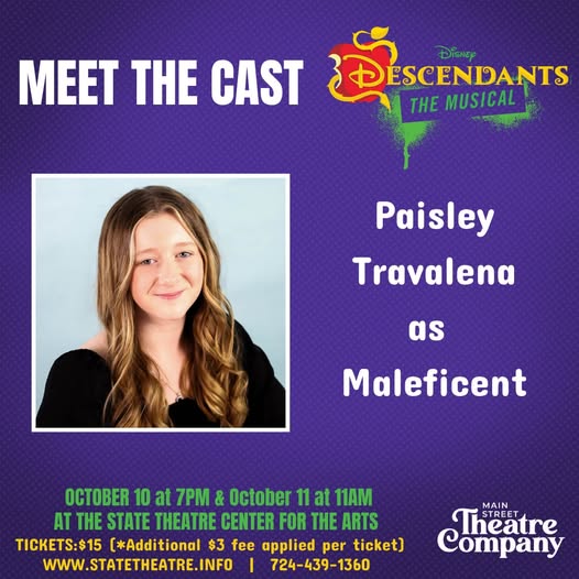 Meet the cast of Disney’s Descendants! Say hello to Paisley as Maleficent! Catch her onstage this October at the State Theatre! 👑✨Disney’s Descendants: The Musical runs October 10 at 7PM and October 11 at 11AM at the State Theatre Center for the Arts. 🎟 Tickets: www.statetheatre.info | 724-439-1360 | Box Office M–F, 9–5 Get ready for a wickedly fun time! 🖤💜 (fb)
