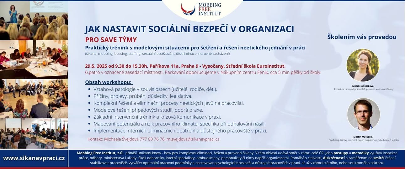 Michaela švejdová Martin matušek Mobbing Free Institut Pomůžeme vám nastavit sociální a psychologické bezpečí v práci. Organizace Buďte o krok napřed. Získejte jedinečné know-how pro vaše interní řešení. Využijte naší expertizy.