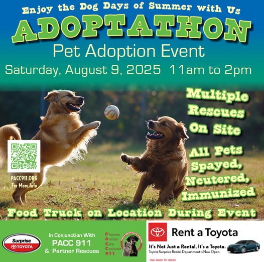 We know it's hot, but it's going to be COOL inside Toyota of Surprise this Saturday! Come find your new furry family member by visiting our Phoenix Animal Care Coalition (PACC911) rescue partners: HARTT - Humane Animal Rescue and Trapping Team Underdog Rescue of Arizona Fur the Paws Cherished Tails Senior Sanctuary All sizes and ages will be on site waiting to meet you! (fb)