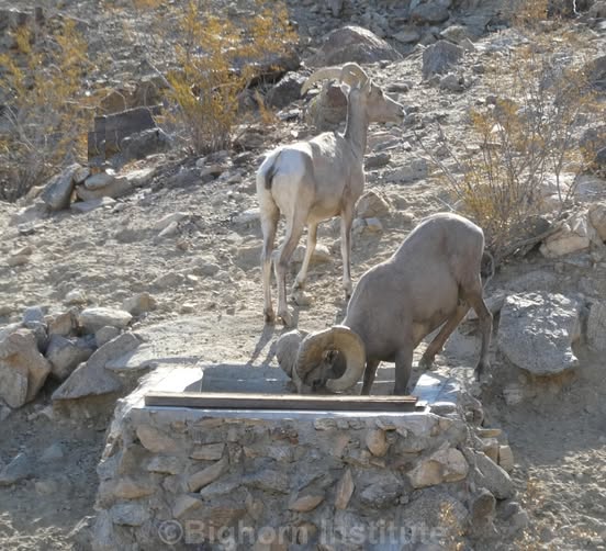 A ram drinks from a man-made guzzler while a ewe stands as a lookout. There are several man-made guzzlers in our area since there is no longer reliable year-round natural water. (fb)
