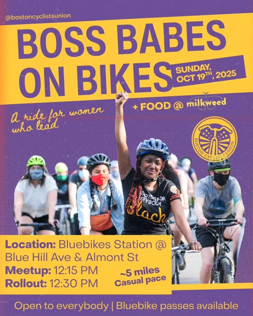 Join the Boston Cyclists Union (BCU), local women leaders, and entrepreneurs for an afternoon of biking, community building, and connection! We'll ride a short stretch of Blue Hill Avenue and roll onto the beautiful Neponset Greenway. This ride is designed for every level, so no need to worry if you're dusting off an old bike or a seasoned rider! Let's have fun! No bike? No problem. Bluebikes will provide day passes for anyone who needs a bike. 📆 Sunday, October 19, 2025 🕖 12:15 PM (Rollout 12:30 PM) 📍 Bluebikes station at the corner of Blue Hill Ave & Almont Street 🚲 ~5 miles, mostly flat, social pace (all levels welcome) (fb)
