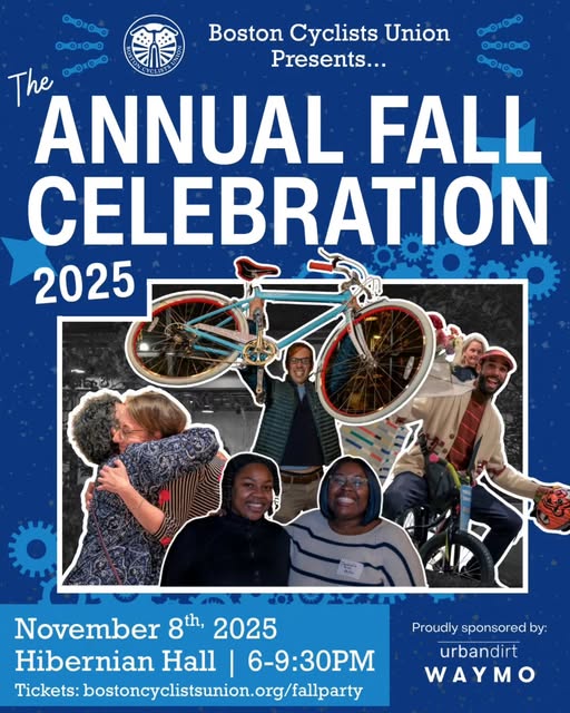 Our annual fall celebration is coming up! Buy your ticket today because we expect to sell out fast 👀 Join us for 🍢 Great food 🥂 Drinks 🎁 Exciting raffle items 🚲 The bike community! Come with a crew, learn about the BCU, get involved and leave with more friends! We'll be returning to our tradition of giving away Golden Cog Awards to our stars in the bike advocacy world! Stay tuned for our announcement of the winners! 📅 November 8th 📍 Hibernian Hall ⏰ 6-9:30PM 🎟 Buy your ticket here 👇 bostoncyclistsunion.org/fallparty (fb)