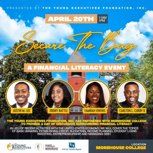 Hey TYE Family and new supporters 💫. We’ve been away and working behind the scenes. In lieu of recent economic activities, we are excited to partner with Morehouse College to offer “Secure The Bag” 💰 a Financial Literacy Event for their students. This financial literacy event is geared to collegiate students; with helping them to feel confident in all things finance. The goal is to have more of our minorities financially secure. Thanks to our community partner Fifth Third Bank and our amazing speakers. (fb)