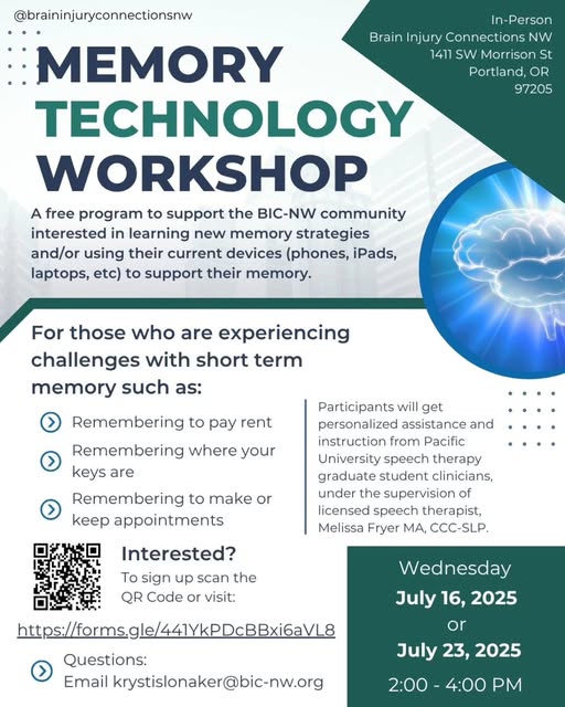 Portland, Oregon area folks, we have dates for the Memory Workshop! Please scan the QR code and pick your preferred date of the two. Looking forward to seeing you! #portlandevents #braininjurysurvivor #memoryworkshop #community (fb)