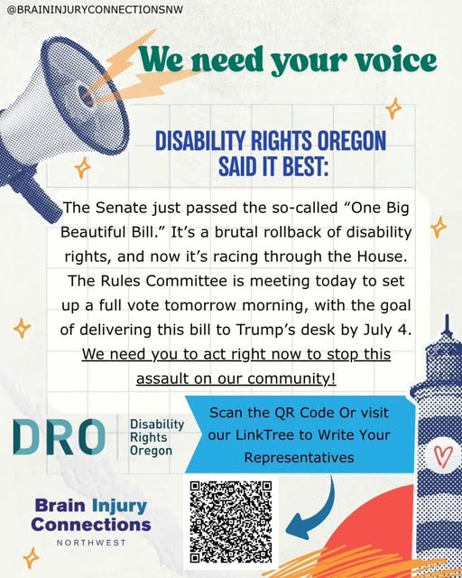 @disability.rights.oregon has created a campaign to make sharing your voice easy. Join us in our efforts to protect Disability Rights by writing to your representatives. Click the link in our linktree, scan the QR code or click https://disabilityrightsoregon.salsalabs.org/tell-representatives-to-vote-no-on-the-one-big-bad-bill/index.html?eType=EmailBlastContent&eId=d792b363-789c-4176-8ab2-4ac6be08c106 To join the conversation. #disabilitypride #community #braininjurysurvivor #advocacy (fb)