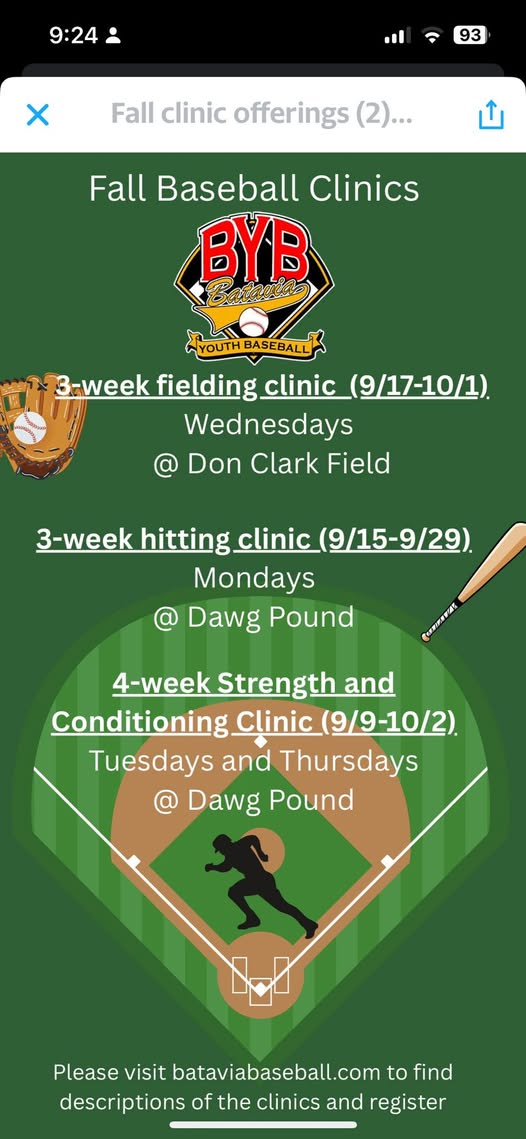 Coach Alex Skupa is hosting some new training clinics for Batavia Youth Baseball players this fall. Alex is a native Batavian who played baseball here and in college, and brings knowledge, skills, and fun to his clinics. See this flyer for more. DM with any questions. We will be sharing more flyers for future clinics in the coming days. Stay tuned. (fb)