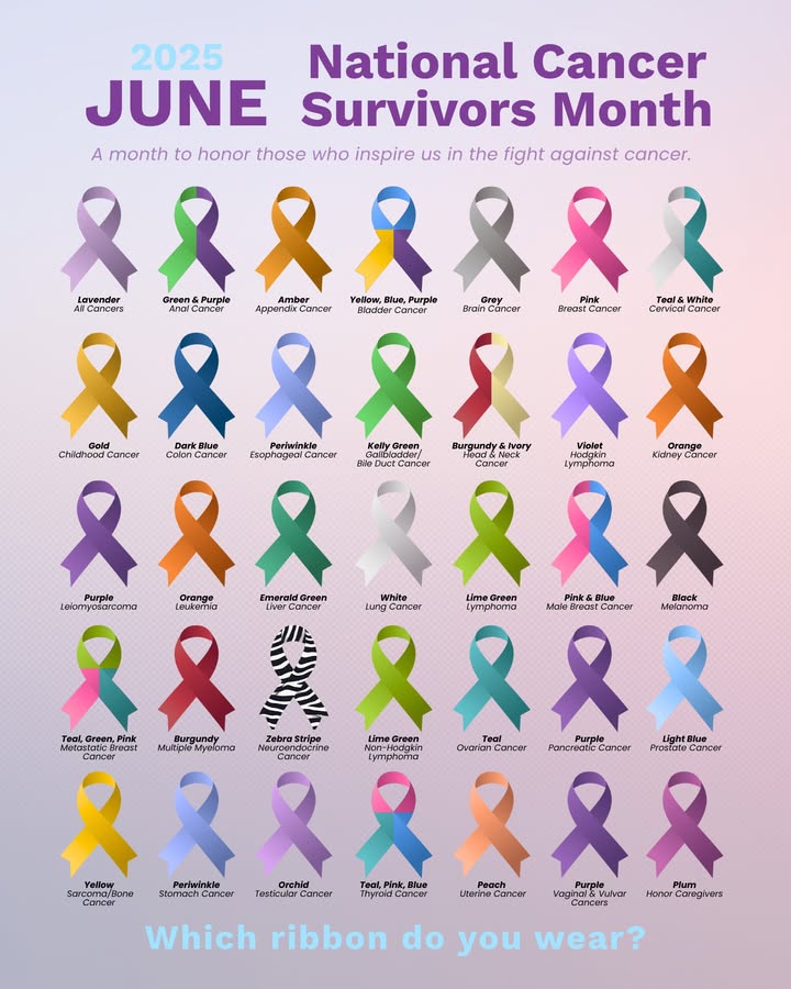 Today and during the month of June, please join us in celebrating the more than 18 million cancer survivors there are in the United States. But, their enduring strength is an inspiration to us everyday. 🎗️ Are you a survivor? Comment which ribbon you wear. #NationalCancerSurvivorsMonth #NationalCancerSurvivorsDay #HelloJune (fb)