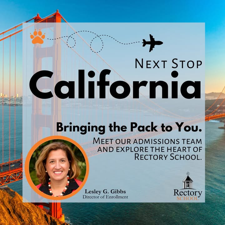 Rectory's Director of Enrollment, Lesley Gibbs, will be in California from April 14th to 18th. Whether you're looking to catch up, get your questions answered, or learn more about Rectory's unique programs, this is the perfect opportunity to connect. Come say hi and make the most of this chance to connect! To schedule a meeting, please email Lesley at lgibbs@rectoryschool.org. (fb)