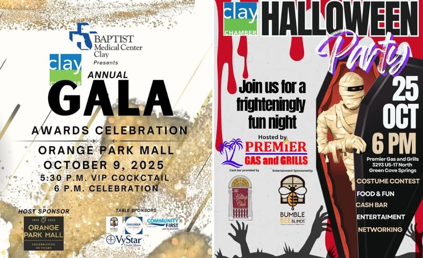 Two great parties, one price! Now through September 8, you can purchase couple tickets (2 tickets) for the Annual Gala and Awards Celebration and Halloween Party at a discounted price. This offer ends on Sept. 8 and only applies to couple ticket packages and is only available for Chamber members. Get tickets: https://business.claychamber.com/events Annual Awards Celebration, presented by Baptist Medical Center Clay and hosted by Orange Park Mall. October 9 | 6 p.m. Halloween Party, Premier Gas and Grills. October 25 | 6 p.m. Entertainment sponsored by Bumble Bee Blinds of Fleming Island. Cash bar provided by The Hilltop Restaurant. (fb)