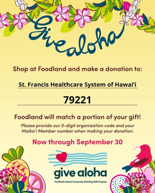 September is Foodland’s Give Aloha month! When you shop at Foodland, you can support St. Francis by making a gift at checkout. Foodland will match a portion of your donation, stretching your impact even further. 🌱✨ Just use our code 79221 at checkout to give! Mahalo for helping us continue our mission of providing excellent, ʻohana-centered hospice and supportive services to Hawaiʻi families. (fb)
