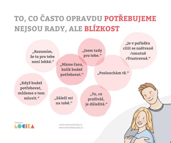 Kolikrát už jste slyšeli radu, když byste potřebovali spíš objetí? 🙌 Někdy je míň víc a úplně stačí, když nám druhý naslouchá a tím vytváří prostor, abychom cestu mohli najít postupně sami. Místo „Musíš se na to dívat pozitivně“ může zaznít třeba: „Rozumím, že to teď pro tebe není lehké.“ To nejdůležitější často není v odpovědi, ale v tom, že tu opravdu jsme. 💡 #detstvibeznasili (fb)