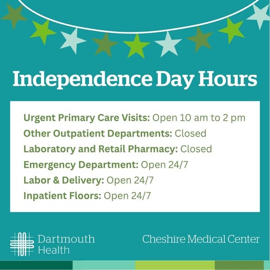 Happy Fourth of July! 🇺🇸 Please review our updated hours for today before stopping by the hospital. (fb)