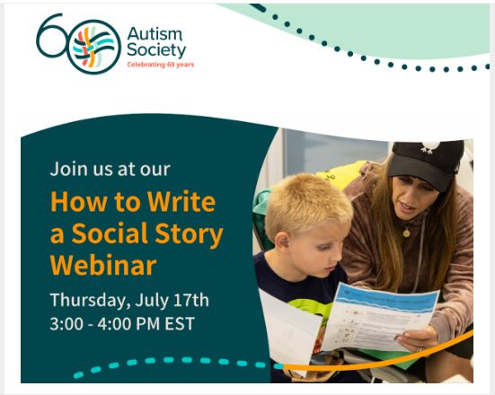 The Autism Society of America invites you to a free webinar, How to Write a Social Story, taking place on Thursday, July 17, 2025, from 3:00 to 4:00 PM ET. Led by experts Dr. Chris Reeve and Dr. Susan Kabot, this session will explore how to create and implement effective social narratives—an evidence-based tool that supports Autistic individuals by reducing anxiety and fostering success in a variety of settings. During the webinar, attendees will learn about the many uses and benefits of social stories, how to appropriately and effectively implement them, and how to adapt each narrative to meet the unique needs of the user. Whether you’re a parent, educator, therapist, or service provider, this session will provide practical insights and tools you can use immediately. Register at: https://events.teams.microsoft.com/event/824a54b7-6e42-4de5-85c3-55eb68b7cba5@8482cbbf-e754-4c66-87d2-c401528dbf81 (fb)