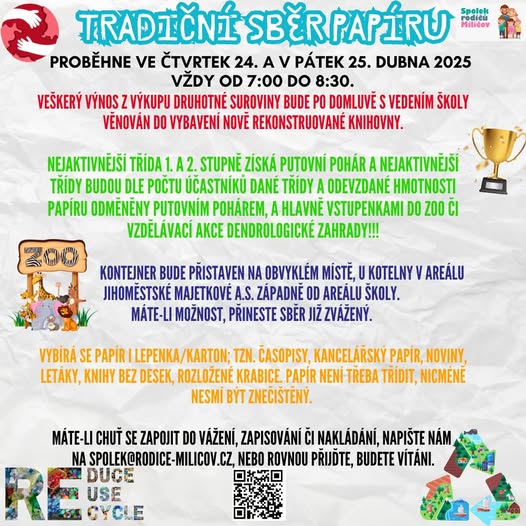Tradiční školní sběr papíru. Výtěžek jde na školní knihovnu a vítězné třídy krom putovního poháru dostanou vstupenky na vzdělávací akci Dendrologické zahrady. (fb)