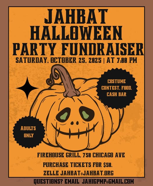 🎃 You’re Invited to a Spooktacular Halloween Bash! 🕸️ Adults Only | Saturday October 25th | 7PM Creep on over to the Firehouse Grill (750 Chicago Ave) for a night full of frightening fun, fang-tastic food, and a cash bar that’ll raise your spirits! 🧛♂️ Costume Contest – Dress to impress (or distress) 🎟️ Zelle jahbat@jahbat.org $50/person to secure your spot. . . before it vanishes into the night! 📧 Email: jahigpmp@gmail.com with any questions (fb)