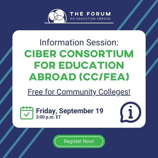 Community College administrators and faculty are invited to apply for the CIBER Consortium for Education Abroad (CC/FEA) Program. We are currently accepting applications through Friday, October 10. https://www.forumea.org/ciber-consortium-for-education-abroad-ccfea.html This fully funded initiative is designed to increase the capacity for community colleges to develop education abroad programs and to develop a workforce with a global perspective by providing comprehensive, wraparound support. To learn more, join us for an information session on Friday, September 19, at 3:00 p.m. ET. https://www.forumea.org/ciber-consortium-for-education-abroad-ccfea.html #ccfea #educationabroad #internationaleducation #freeinfosession #communitycolleges (fb)