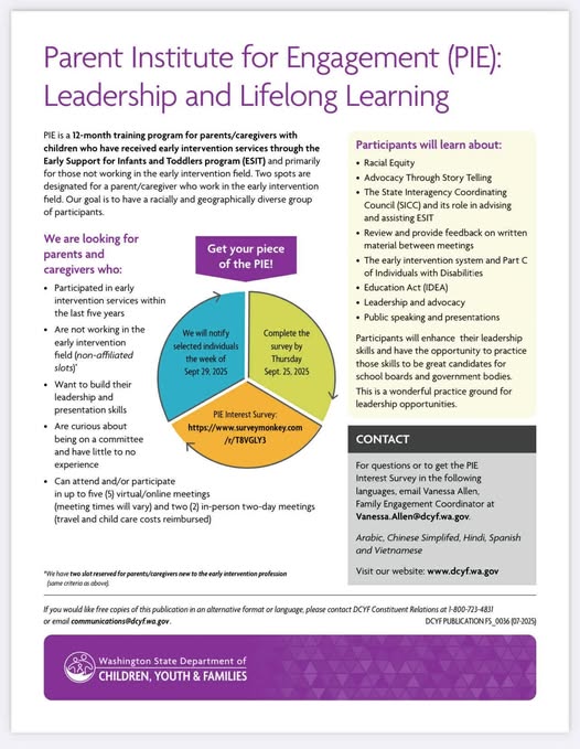 This is a fantastic learning opportunity for parents and guardians of young kids with disabilities in Washington State ------------------ PIE Cohort 8 Applications are OPEN! Survey Monkey link here: PIE Cohort 8 Application Survey Want to make a difference for children with developmental delays or disabilities? 💙 Join the Parent Institute for Engagement (PIE) – a free, year-long program where you’ll: Learn advocacy & leadership skills Connect with other amazing families Help improve early support services in Washington Apply by: Sept. 25 Hear back: Week of Sept. 29 Let’s build strong family leaders – together! (fb)