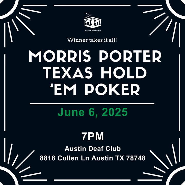 ♠️♥️ Ready to go all in? ♦️♣️ Morris Porter’s Texas Hold’em Poker Night is hitting the table at Austin Deaf Club! Bring your poker face and join us for a night of high stakes, low bluffs, and endless fun. Whether you’re a seasoned player or just learning the ropes, this table is open to all. 🃏 Great vibes 💰 Friendly competition 🏆 Bragging rights included Think you’ve got what it takes to win the pot? Pull up a seat! #AustinDeafClub #TexasHoldEm #PokerNight #DeafEvents [ID: This flyer promotes the Morris Porter Texas Hold ’Em Poker event hosted by the Austin Deaf Club. It will take place on June 6, 2025, at 7 PM at 8818 Cullen Ln, Austin, TX 78748. The tagline reads “Winner takes it all!”, emphasizing a competitive poker night. The design includes bold text and decorative sunburst corner elements.][EOM] (fb)