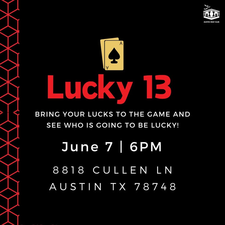 🍀🎰 Lucky 13 is happening at Austin Deaf Club! And guess who’s hosting AGAIN? That’s right, our Vice President, TJ! 😎 You already know it’s gonna be a good time. Come test your luck, laugh with friends, and see if 13 really is your lucky number. TJ will be bringing the energy, the sass, and maybe even a little side-eye if you win too much. 😉 🎲 Deaf-friendly 🎉 Full of laughs 💸 Good vibes, great company, and maybe a win or two Don’t miss it, you know it’ll be fun when TJ’s running the show! #AustinDeafClub #Lucky13Night #DeafEvents [ID: This flyer is for Lucky 13, a game night hosted by the Austin Deaf Club. The event takes place on June 7 at 6 PM at 8818 Cullen Ln, Austin, TX 78748. The tagline reads: “Bring your lucks to the game and see who is going to be lucky!” The design features a black background, red accents, playing cards, and a hexagonal pattern on the left side.][EOM] (fb)