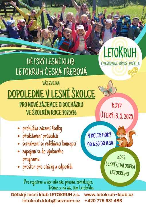 Život je plný rozhodnutí. A výběr školky patří k těm nejdůležitějším. Otevřete vrátka mezi stromy a přijďte za námi do lesa. V úterý 13. 5. 2025 od 8:30 do 11:30 v chaloupce naší lesní školky v Přívratě poodhalíme, jak se učíme v mechu a kapradí, pod slunečními paprsky či mezi kapkami deště. Co se bude dít? - projdeme si zázemí (i s částí říše fantazie), - představíme průvodce (nebo lesní víly), - řekneme si o naší vzdělávací koncepci (s pravidly je svět čitelnější), – mrkneme na to, jak vypadá „běžný den“ (který je svou pestrostí každý jiný). Co s sebou? – boty, co se nebojí bláta, – oblečení, které miluje stromy, - batůžek se svačinou, – otázky, zvídavost a hravost (nebo jen klidné pozorování – to umíme taky). Jsme tu s vámi již 8 let. Těšíme se, váš tým Letokruhu 💚🌺🍀🌼 (fb)