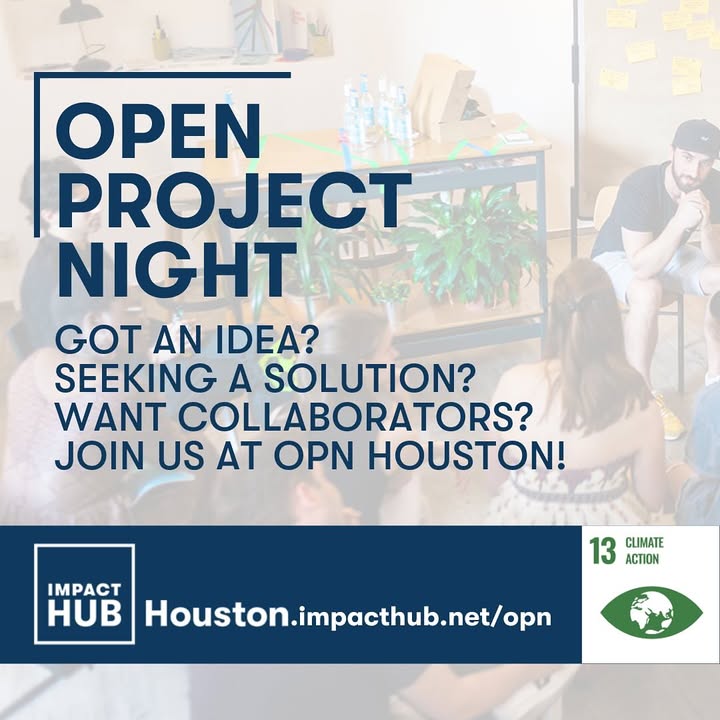 This Thursday, April 17th: You’re invited to join us in person to hack solutions together for #Houston as we discuss how to take urgent action to combat climate and its impacts! #SDG13 💚 Here’s how Open Project Night works: ◾️Anyone can sign up to participate (whether you have an idea/project or just want to provide feedback, advice, or support) ◾️Our host will introduce the theme and kick-off project presentations ◾️Open Mic for attendees to pitch will follow (2 min max per pitch) ◾️Everyone will move around the breakout rooms for open networking & collaboration 5:30-6PM Open Networking 6-6:30PM Project/Idea Presentations 6:30-7PM More Networking & Collaboration See you there! #HouImpact #OPNHou RSVP: Link in Bio (fb)